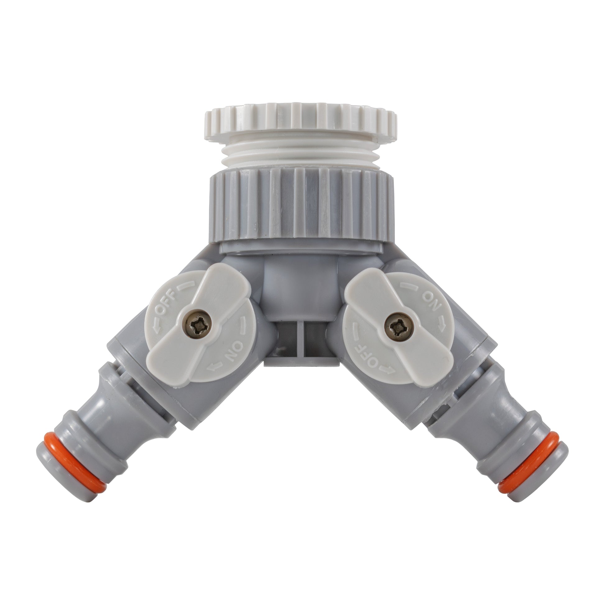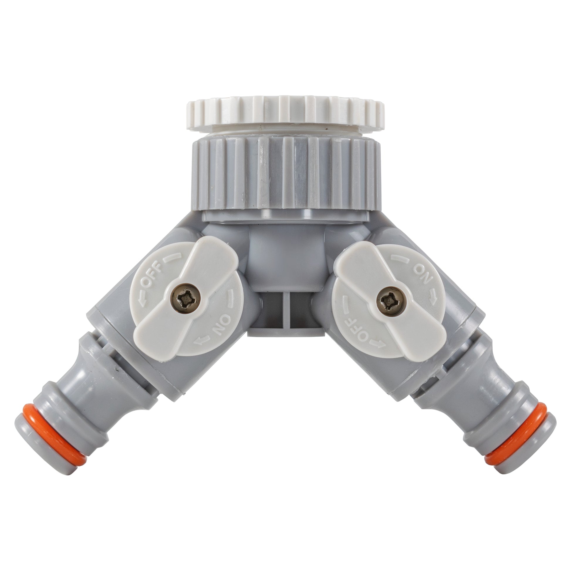 2-Way Tap Connector With Valves 1" or 3/4" BSP Female, Gray/White