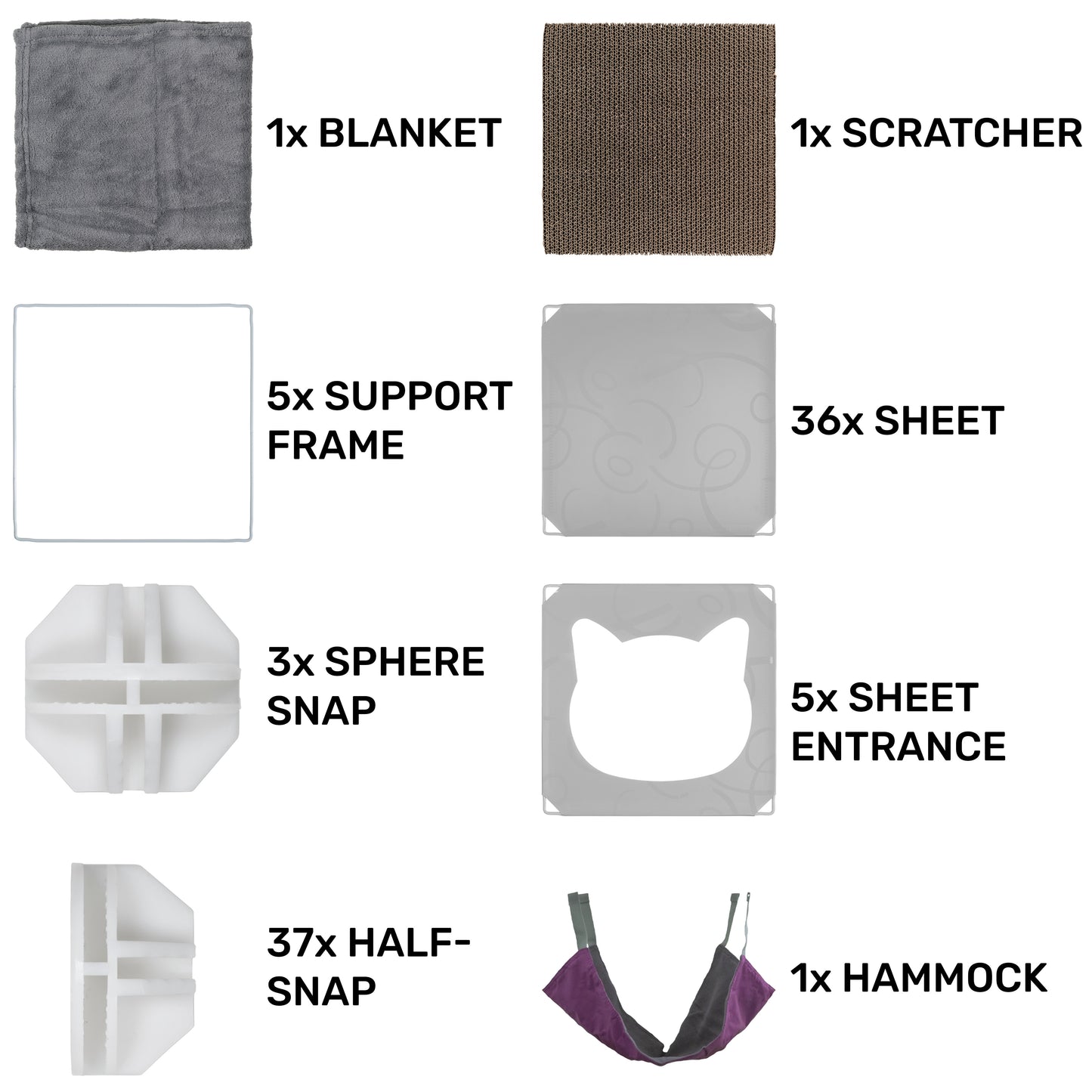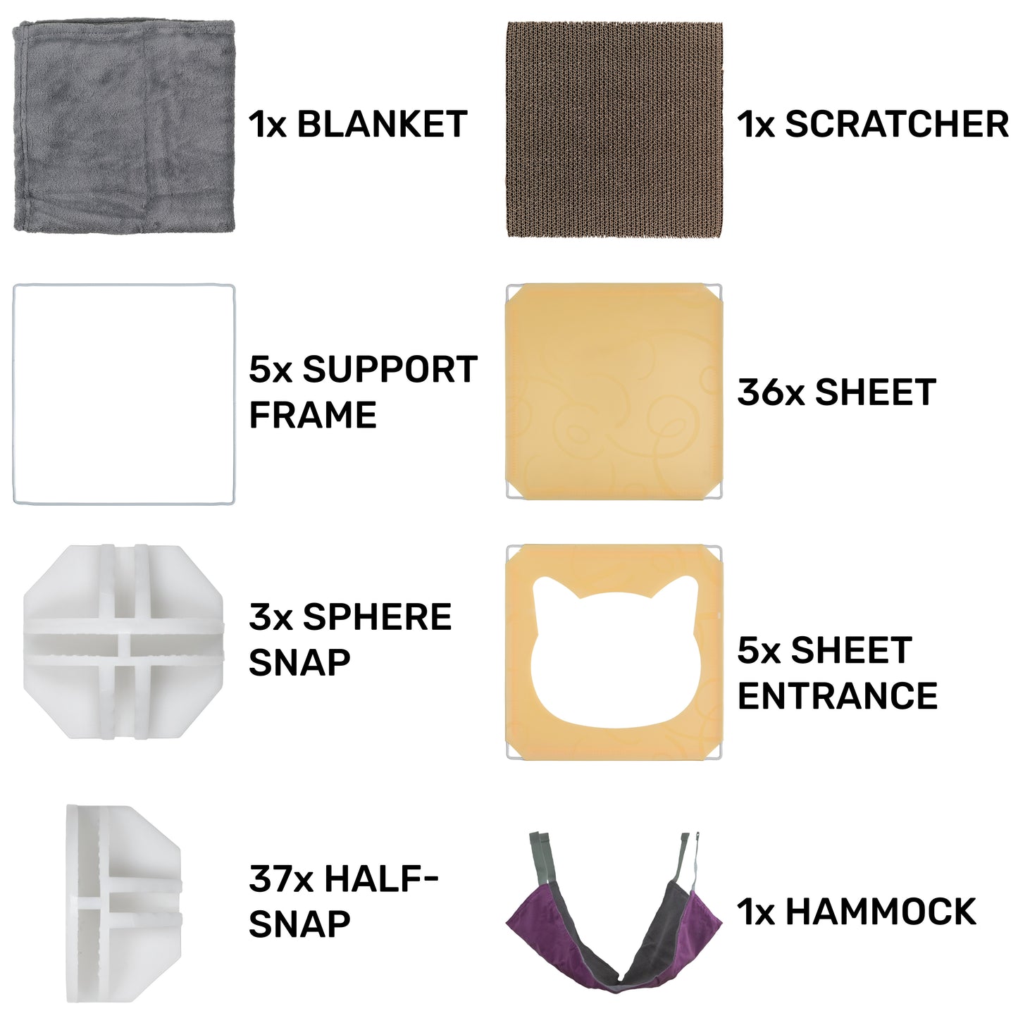 Cozy Hammock: The kit also includes a comfortable hammock for your cat to lounge or sleep in. The hammock comes with clips that fix onto the metal frame of the cubes.