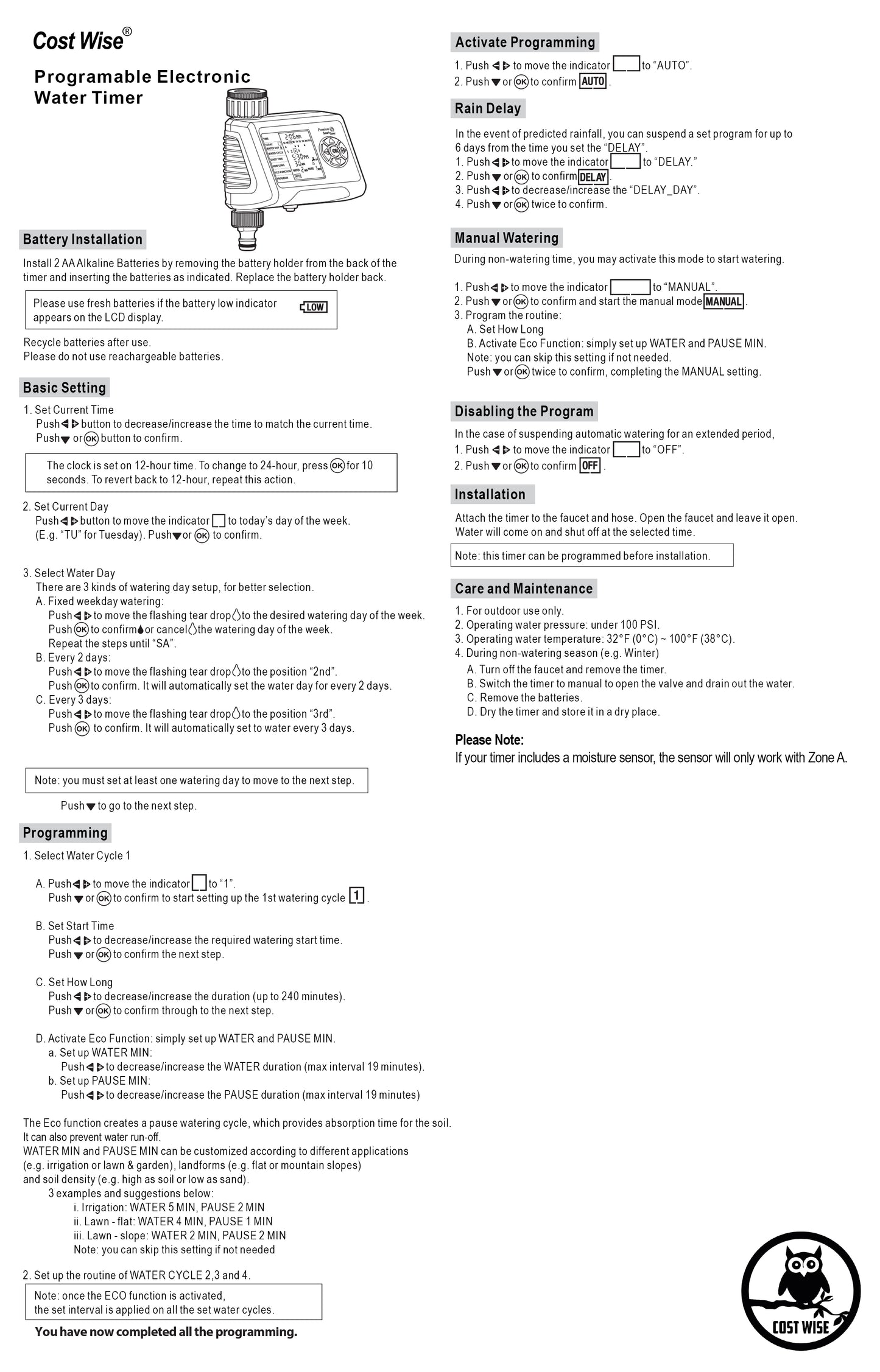 - Timer Installation: Attach the timer to the faucet and hose. Open the faucet and leave it open. Water will come on and shut off at the designated times.