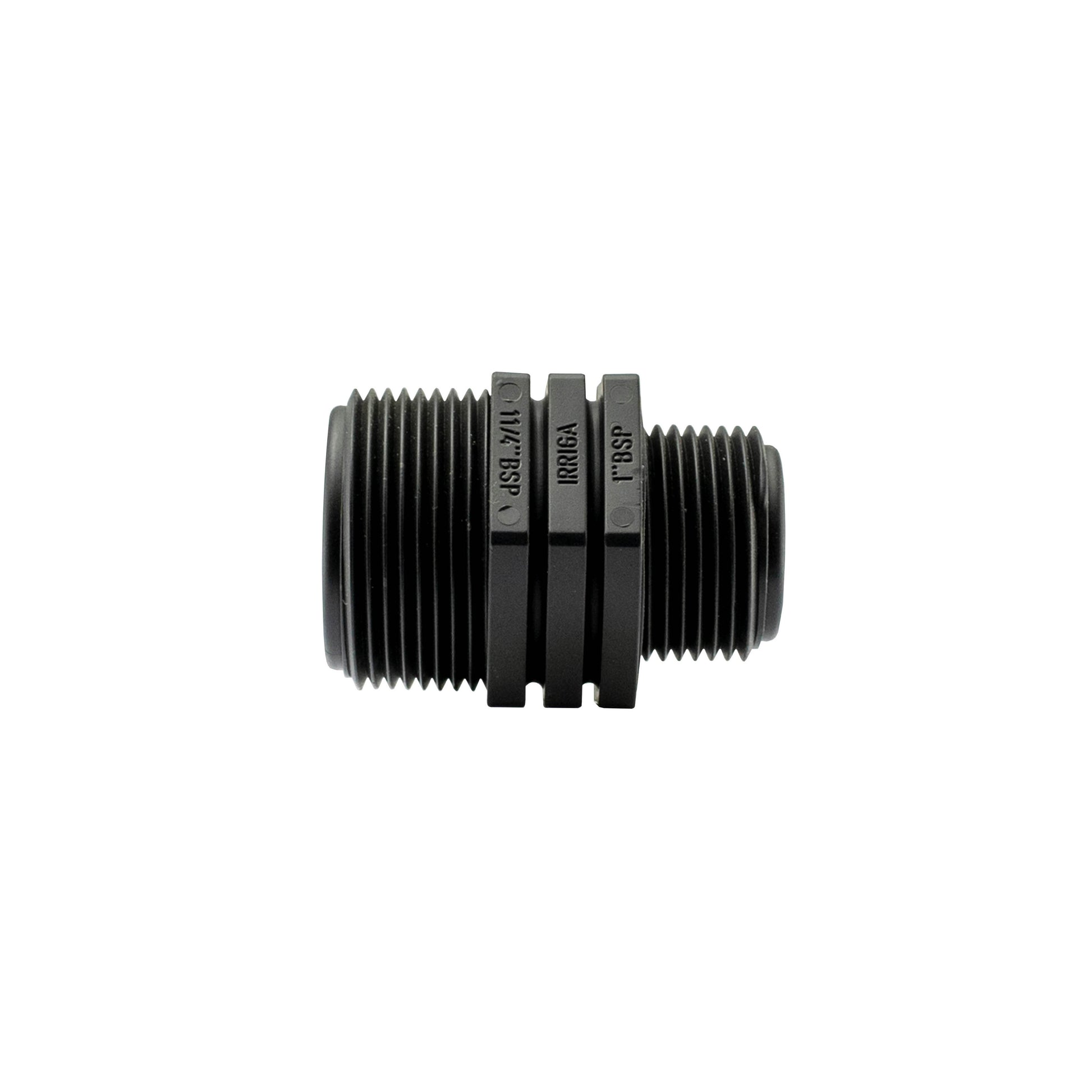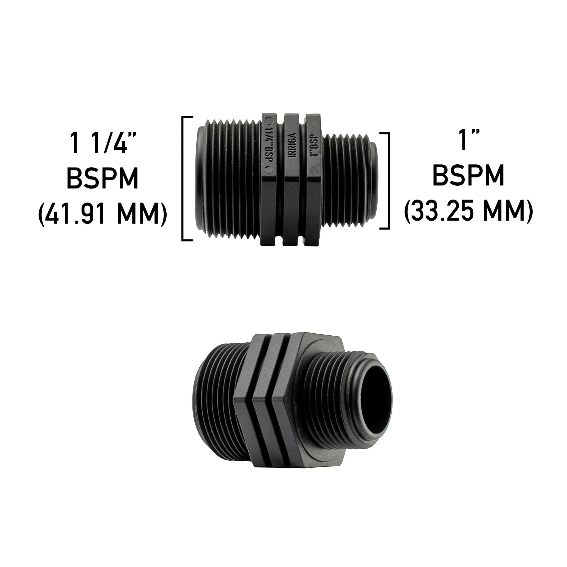 This connector has a 1” BSP Male thread and a 1.25” BSP Male thread. The connector is a versatile and essential component in fluid transport systems. Designed with a reducing BSP (British Standard Pipe) thread, this connector seamlessly adapts larger threaded fittings to smaller ones, ensuring compatibility across various components. Its robust design makes it a reliable choice for both residential and commercial applications where thread size adjustment is necessary.