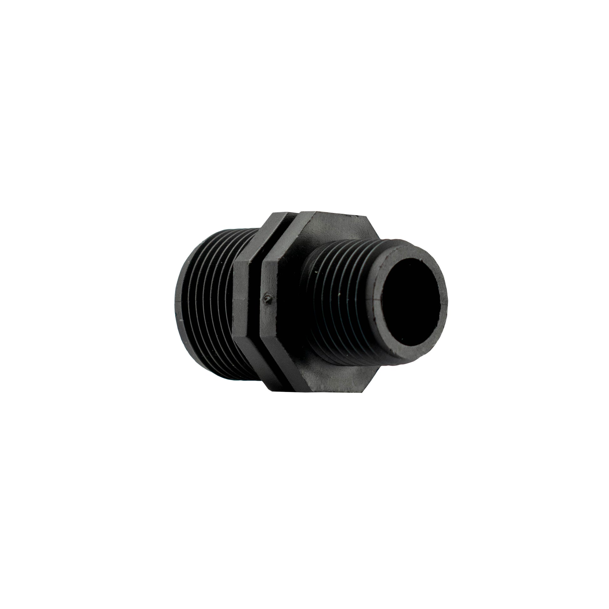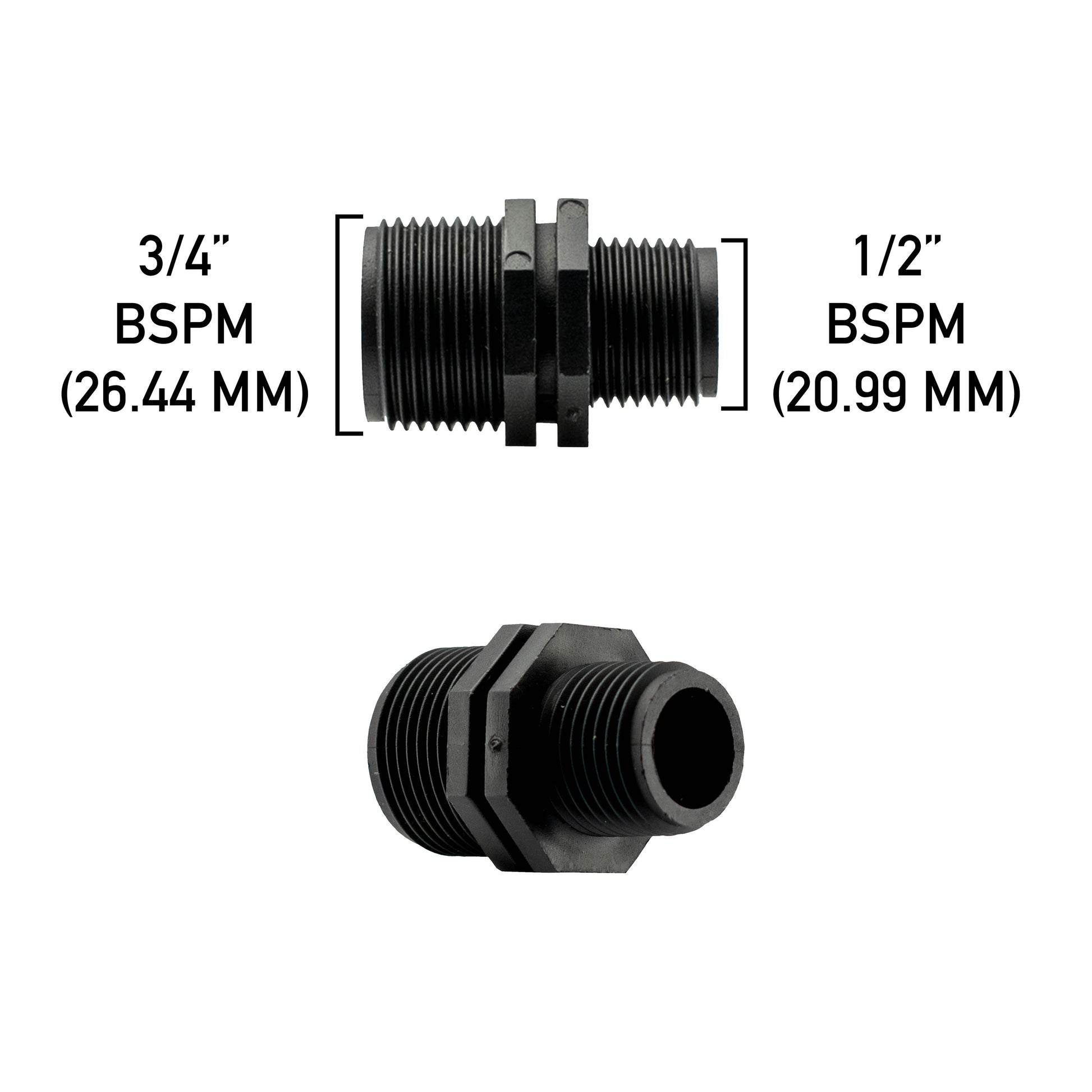 This connector has a 1/2" BSP Male thread and a 3/4” BSP Male thread. The connector is a versatile and essential component in fluid transport systems. Designed with a reducing BSP (British Standard Pipe) thread, this connector seamlessly adapts larger threaded fittings to smaller ones, ensuring compatibility across various components. Its robust design makes it a reliable choice for both residential and commercial applications where thread size adjustment is necessary.