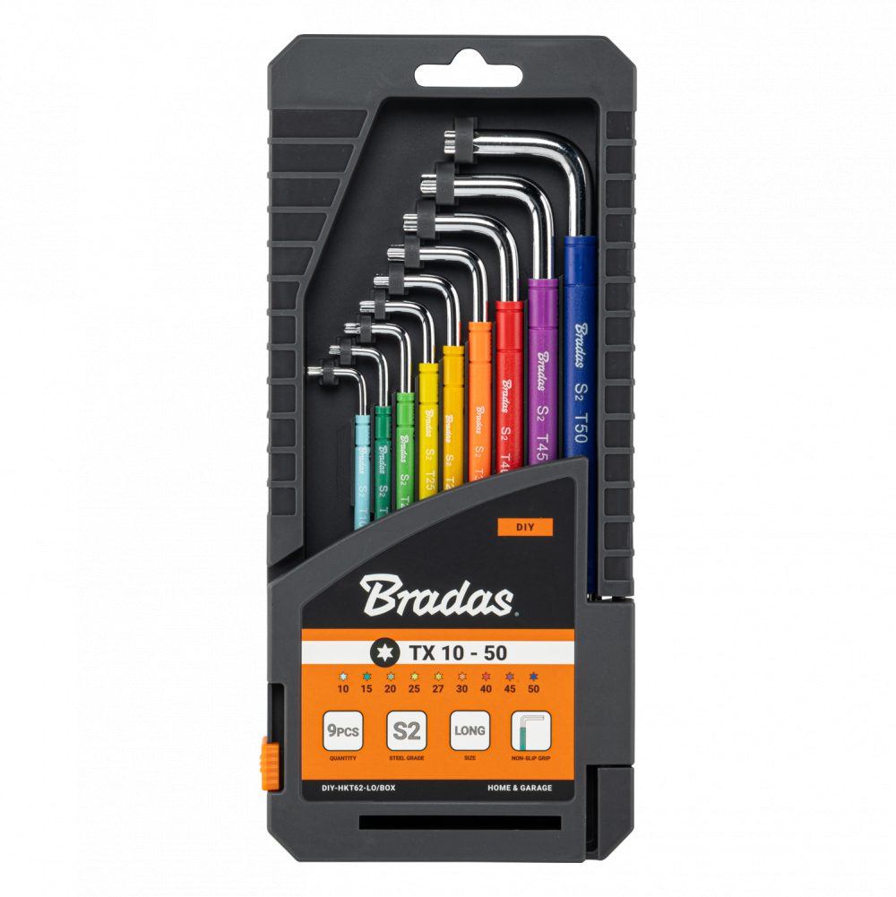 The set includes the following TORX key sizes and colours: TX10 in light blue, TX15 in dark green, TX20 in light green, TX25 in yellow, TX27 in dark yellow, TX30 in orange, TX40 in red, TX45 in purple, and TX50 in dark blue. With a full range of sizes, this versatile set is a reliable addition to any toolkit.