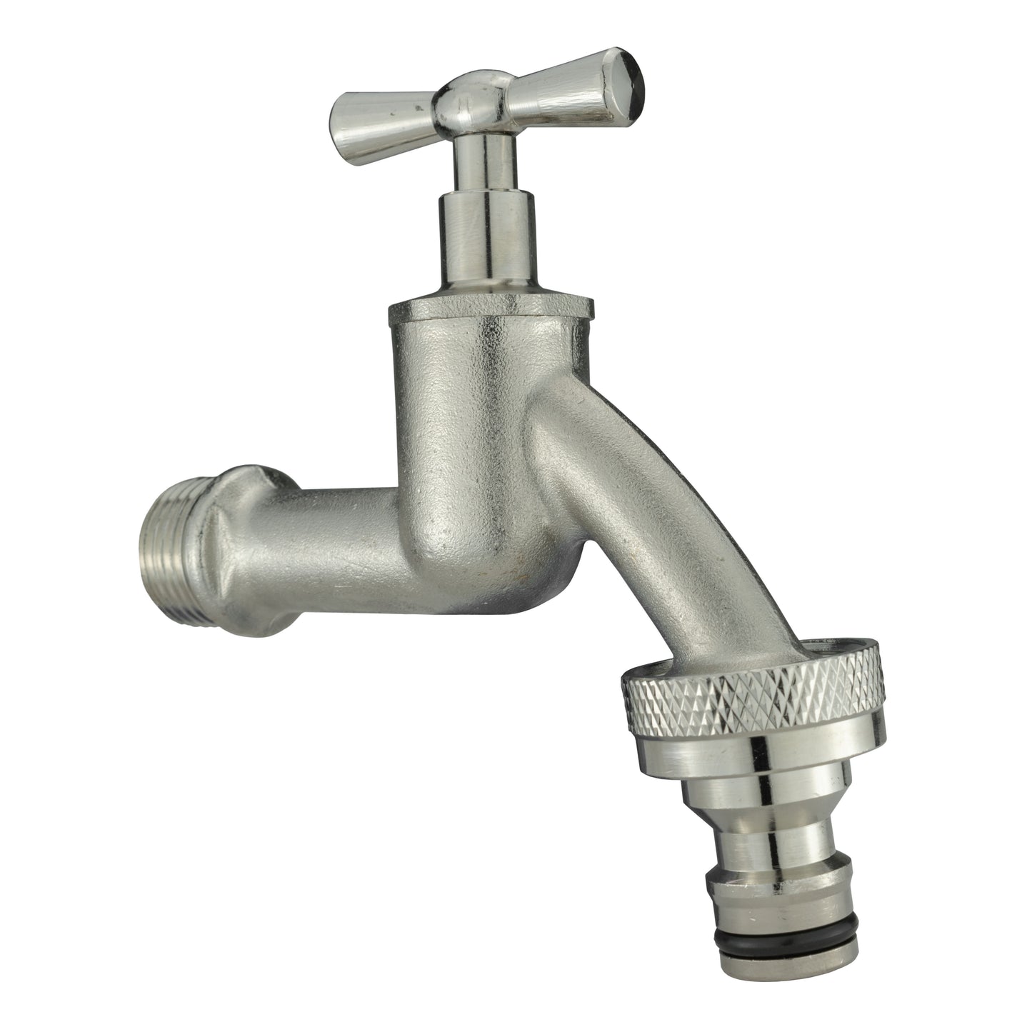 This garden bib tap is completed with a Snap-On Male Tap Connector - 3/4" BSPF. This is a high-quality, durable component designed to streamline your gardening and plumbing tasks. Constructed from robust brass and finished with a nickel plating, this connector is engineered for longevity and resistance to corrosion. The 3/4" BSP Female thread of this connector is specifically designed to connect seamlessly with the 3/4" BSP Male thread on the outlet of the garden bib tap.